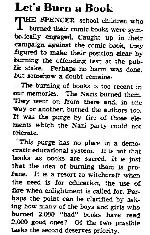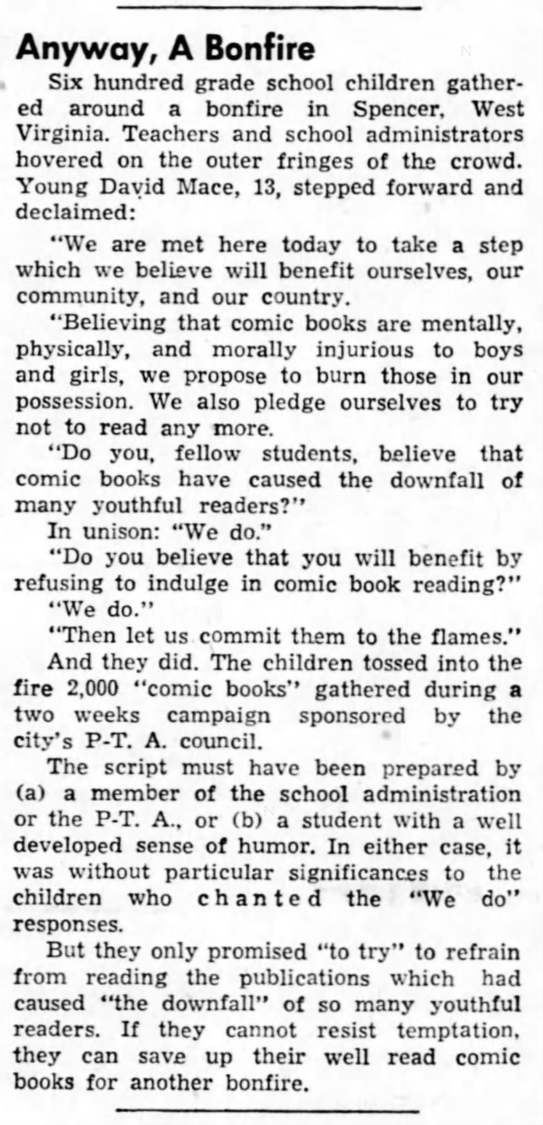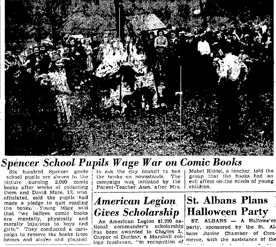 A photo and caption in the October 27, 1948, edition of the Charleston Daily Mail (today, Charleston is approximately an hour from Spencer) reported six hundred Spencer grade school students attended the burning of “2,000 comic books after weeks of collecting them and David Mace, 13, who officiated, said the pupils had made a pledge to quit reading the books.”