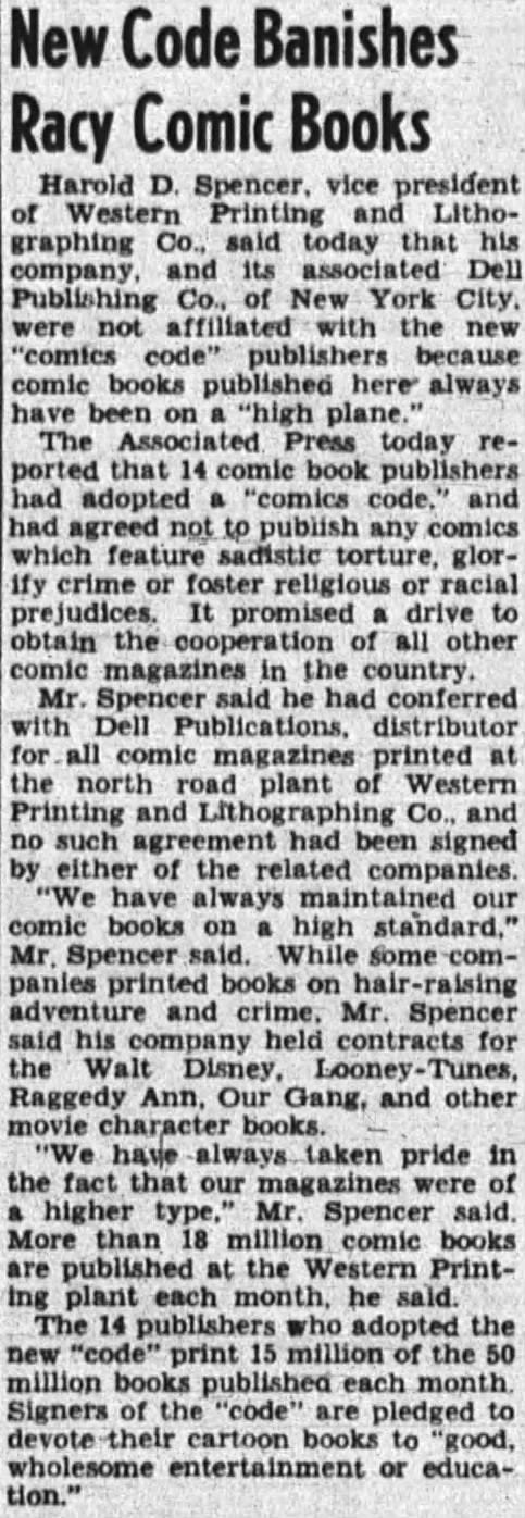 Furthermore, the comic industry itself had felt the public pressure and started self-regulating just a few months before the Spencer burning. The Associated Press reported on July 2, 1948, that “14 comic book publishers had adopted a ‘comics code,’ and had agreed not to publish any comics which feature sadistic torture, glorify crime or foster religious or racial prejudices. It promised a drive to obtain the cooperation of all other comic magazines in the country.” (This Publishers Code adopted by the Association of Comics Magazine Publishers was deemed largely ineffective until the formation of the Comics Code Authority formed in September 1954.)