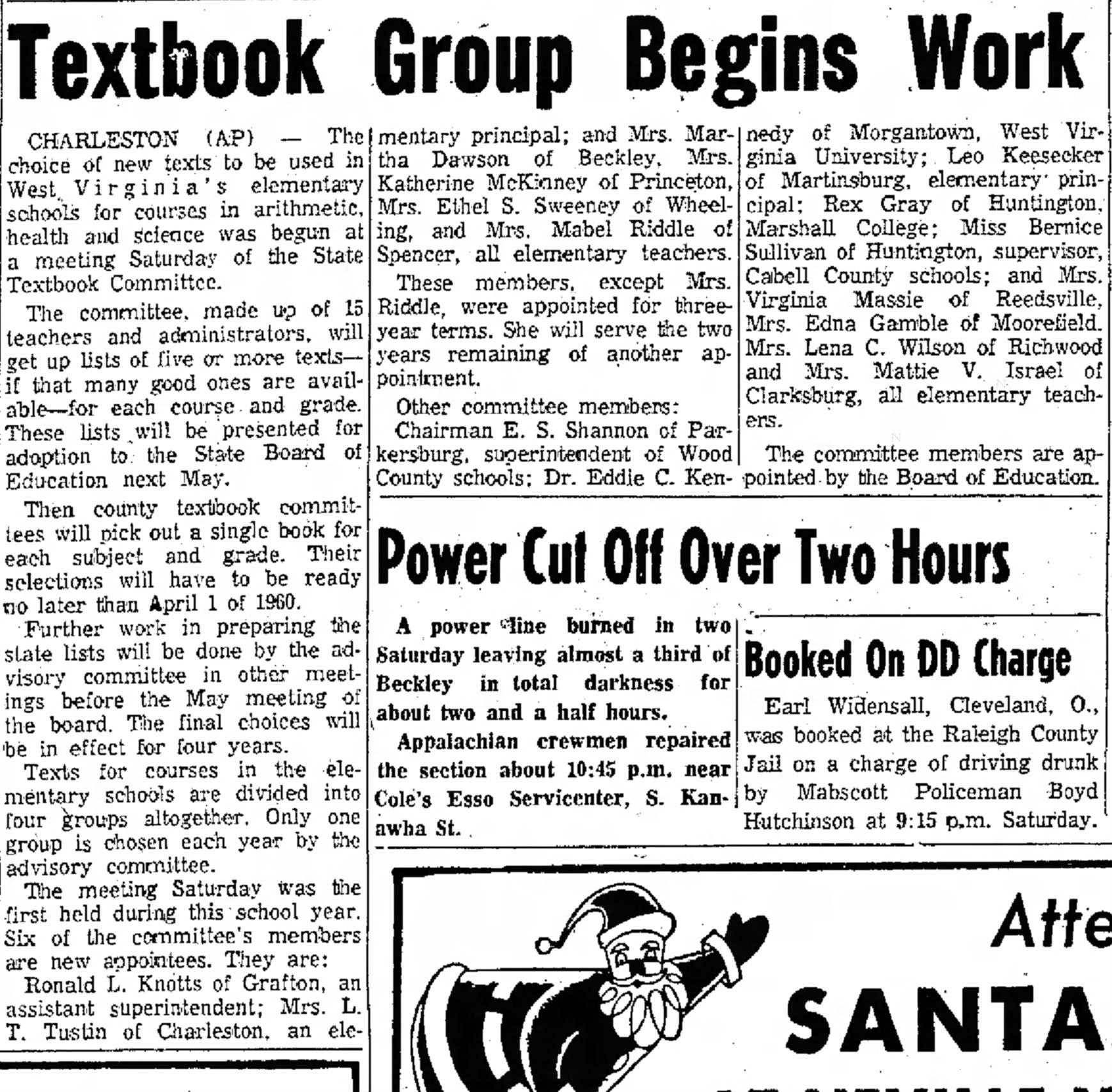 I found an article from three years later where West Virginia’s State Textbook Committee were beginning to choose new math, health, and science textbooks for the state’s elementary schools. The selections had to be ready no later than April 1, 1960. April Fool’s Day. Six of the committee’s members were new employees, all of whom were elementary teachers, and one of whom was Mrs. Mabel Riddel (misspelled as “Riddle” in the story here like in Orlean’s book).