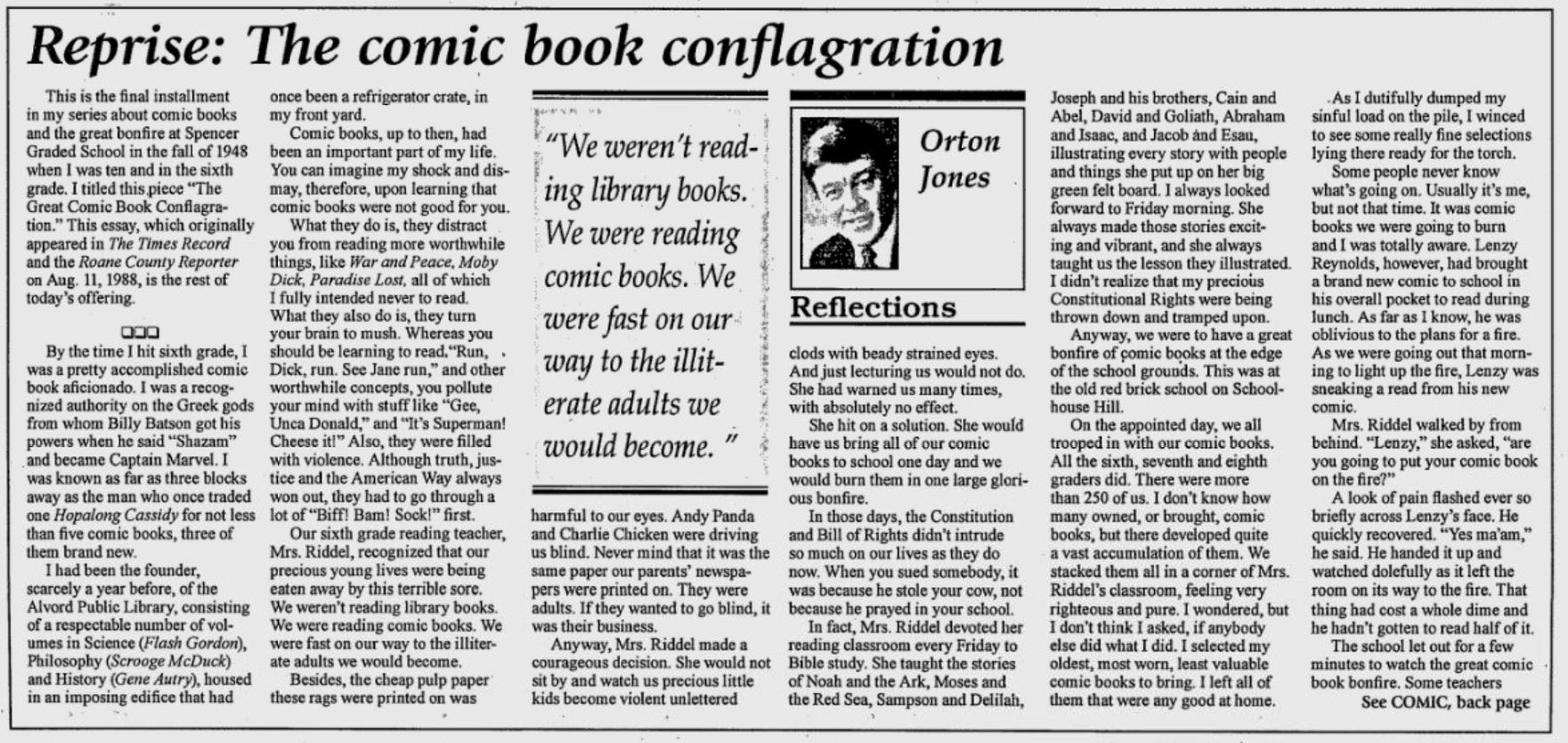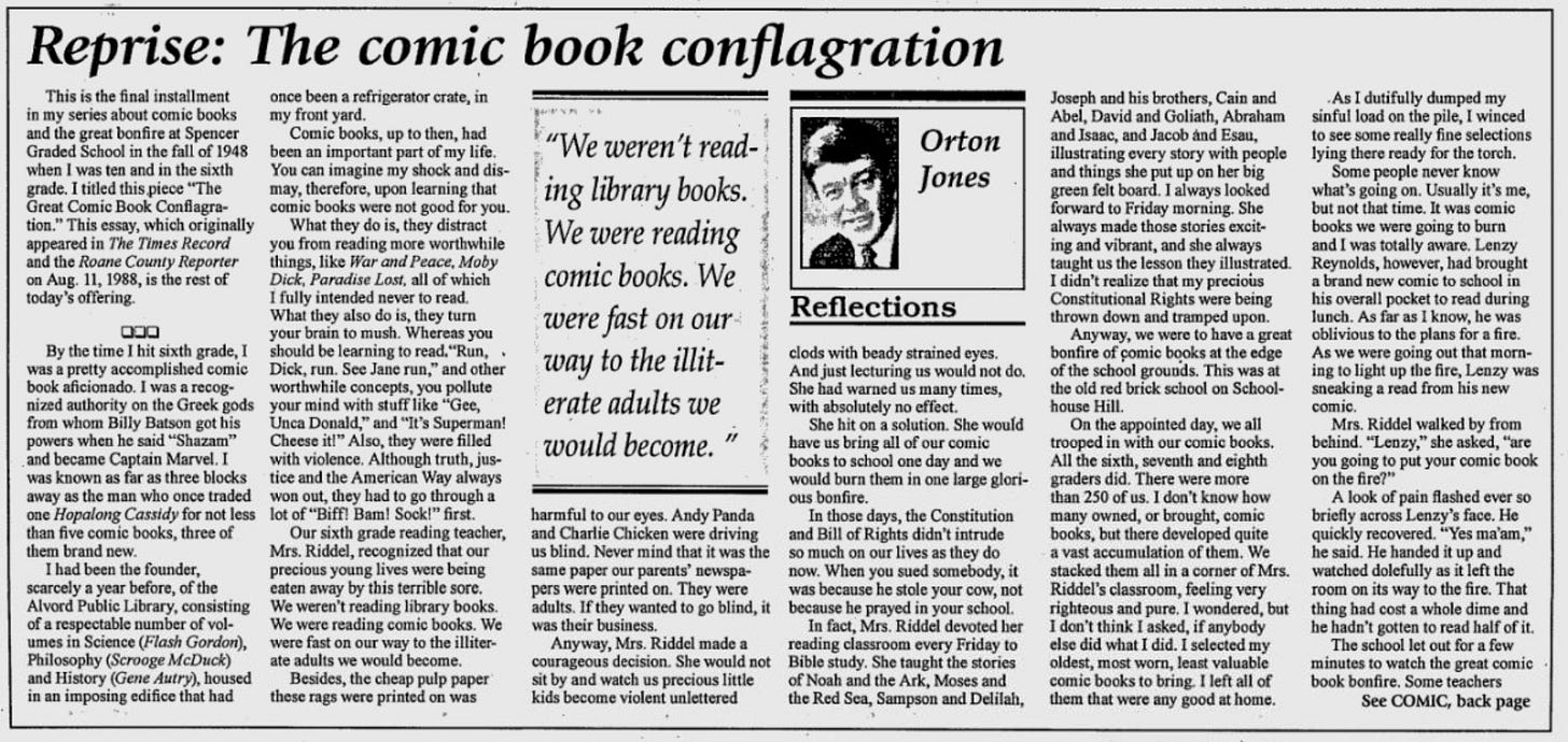 However, he only brought his “most worn, least valuable comic books” to the bonfire and left the good ones at home. His classmate, Lenzy Reynolds, was inconspicuously reading from his newest comic when Mrs. Riddel asked him if he was going to put it on the fire. “Yes, ma’am,” responded Linzy. “That thing cost him a whole dime,” writes Jones, “and he hadn’t gotten to read half of it.”