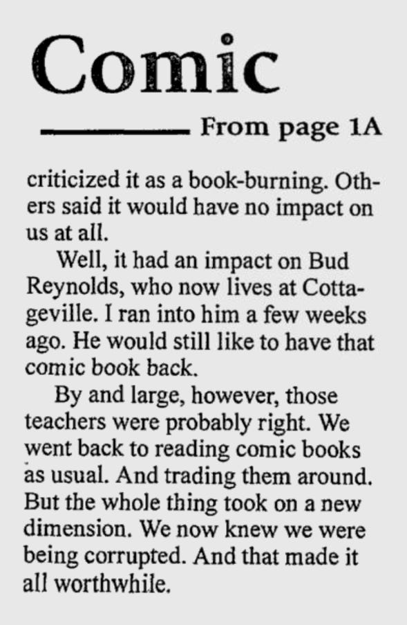 “By and large, however, those teachers were probably right. We went back to reading comics as usual and trading them around. But the whole thing took on a new dimension. We now knew we were being corrupted. And that made it all worthwhile.”