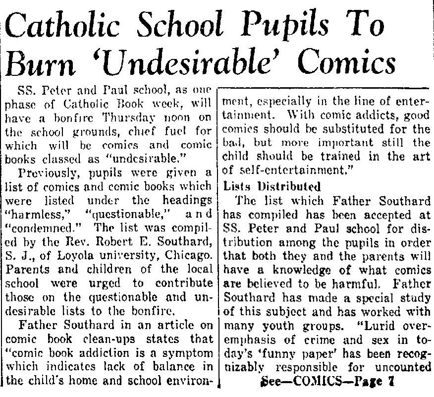 “The first reported comic-book burning took place in November of 1945 in Wisconsin Rapids, Wisconsin, a town of eleven thousand located about a hundred miles north of Madison. The children of Saints Peter and Paul School torched 1,567 comic books accumulated during a school-sponsored collection drive, all titles which a Catholic censor had classified as “condemned” (Batman, The Green Hornet, Wonder Woman) or “questionable” (Dick Tracy, Orphan Annie, L’il Abner). Two years later, students at Chicago’s St. Gall’s School burned three thousand comics after a collection drive organized at the impetus of a ten-year-old student.
